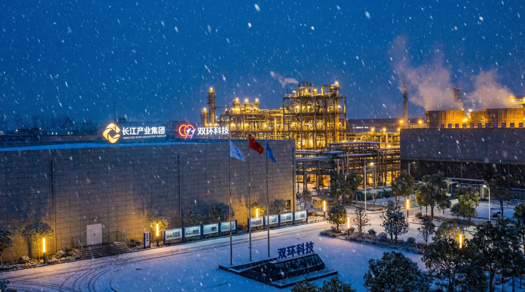 双环科技的厂区内,化工装置平稳运行,灯火在飞雪中晕开一圈圈暖黄的光。