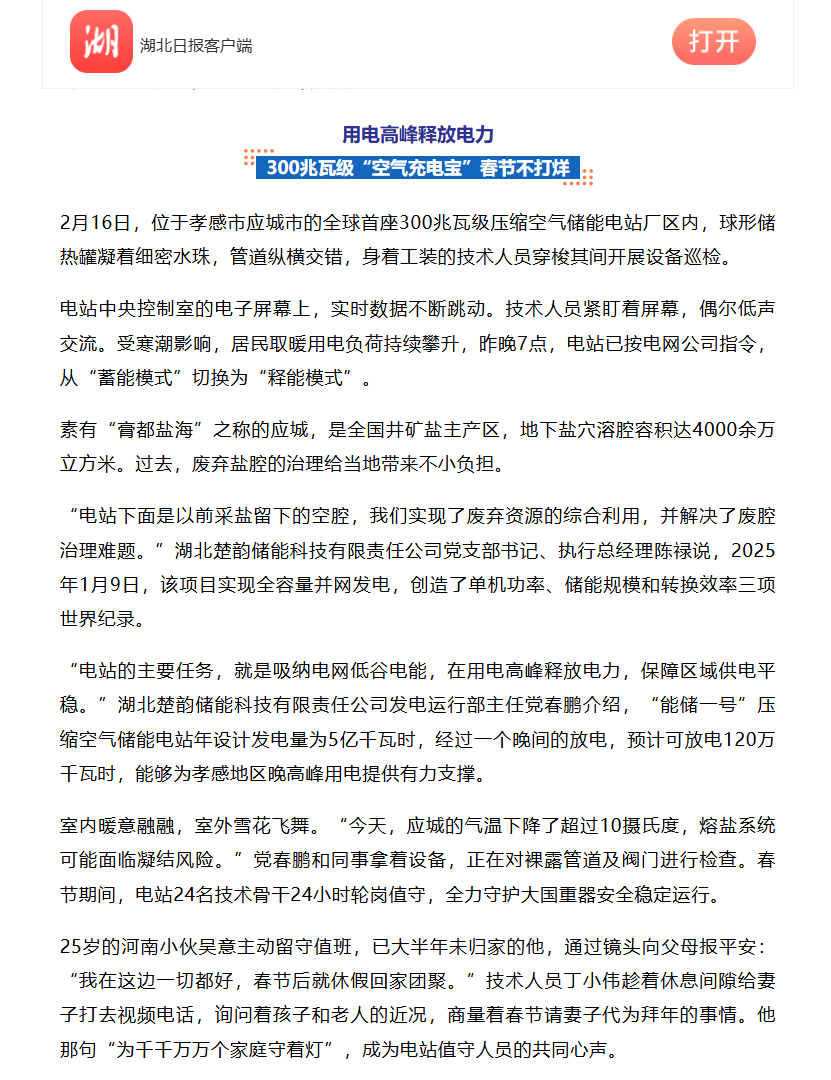 “300兆瓦储能项目”,这几个字在脑海中迅速闪过——世界首座、三项世界纪录、多次登上央视新闻……在这个万家团圆的春节节点,如果能切入“保供”这个民生视角,或许不仅能完成一篇县级融媒体的报道,更有可能向上级媒体输送一条高质量的稿件。