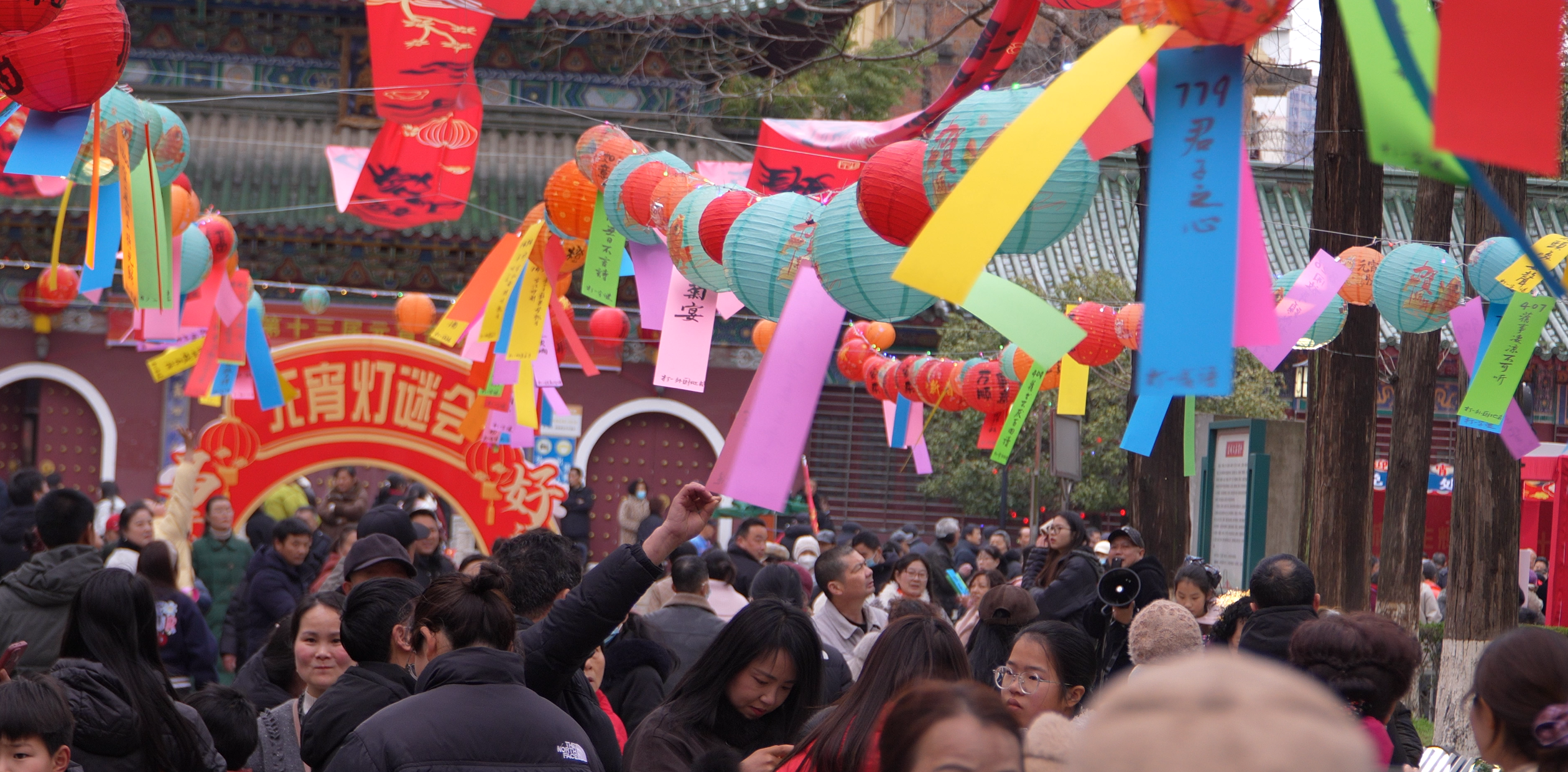 灯谜集会涵盖了应城历史文化、非遗美食、城市建设等内容,是整个活动的一大亮点,不少市民和游客搭“人梯”抢“谜面”中大奖。