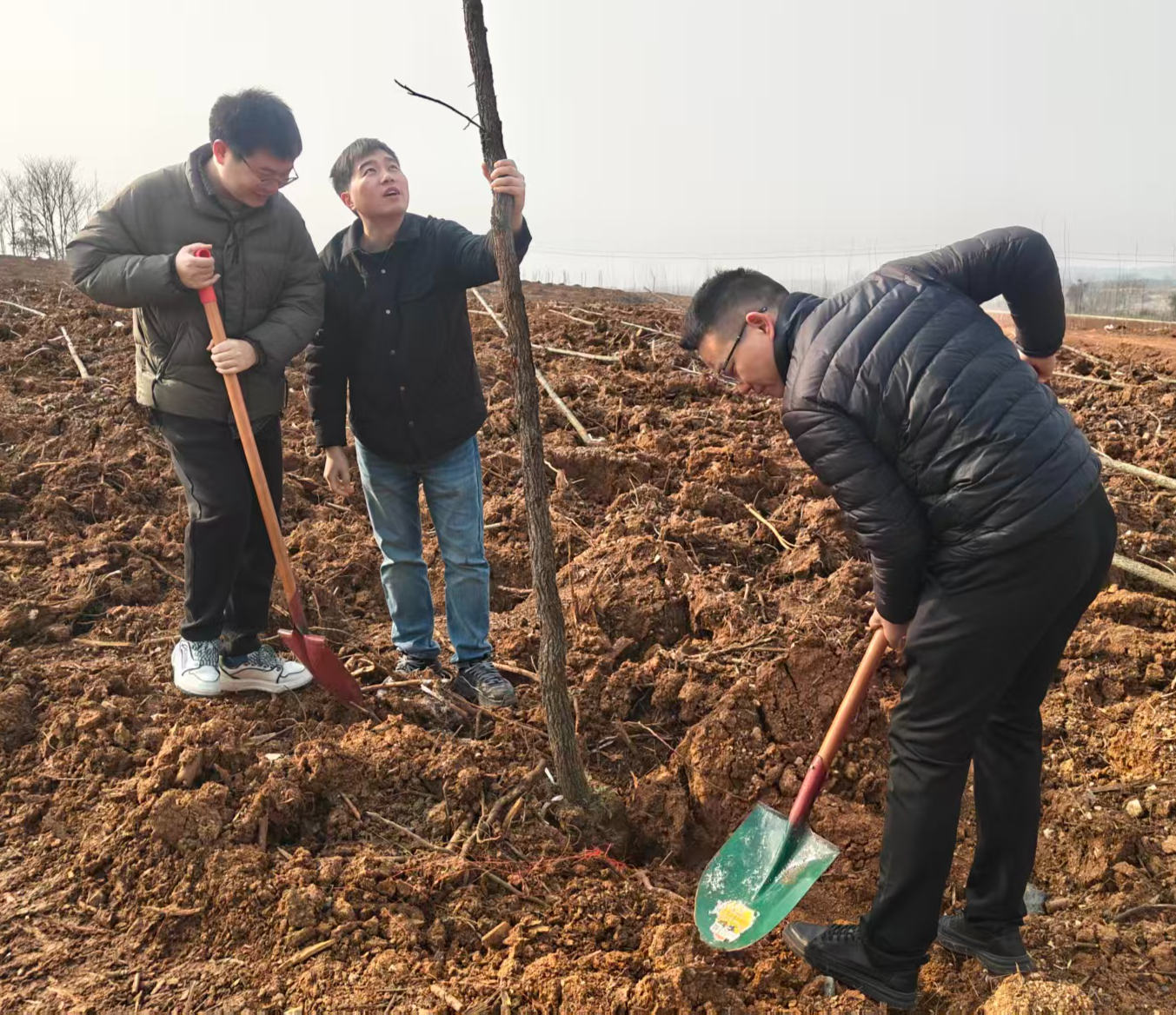 大家铲土挥锹、施肥浇水、正苗扶树,齐心协力种下一棵棵小树苗。