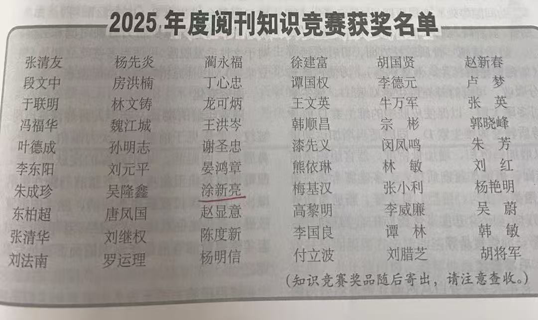 本次竞赛,旨在引导老年群体深化期刊阅读、提升文化素养。涂新亮同志长期坚持研读《当代老年》杂志,在日常阅读中广泛涉猎文史哲经等领域知识,注重学习积累,将厚实的阅读积淀转化为竞赛中的优异表现,连续四次取得佳绩,彰显出退休干部笃学不倦、与时俱进的精神风貌。