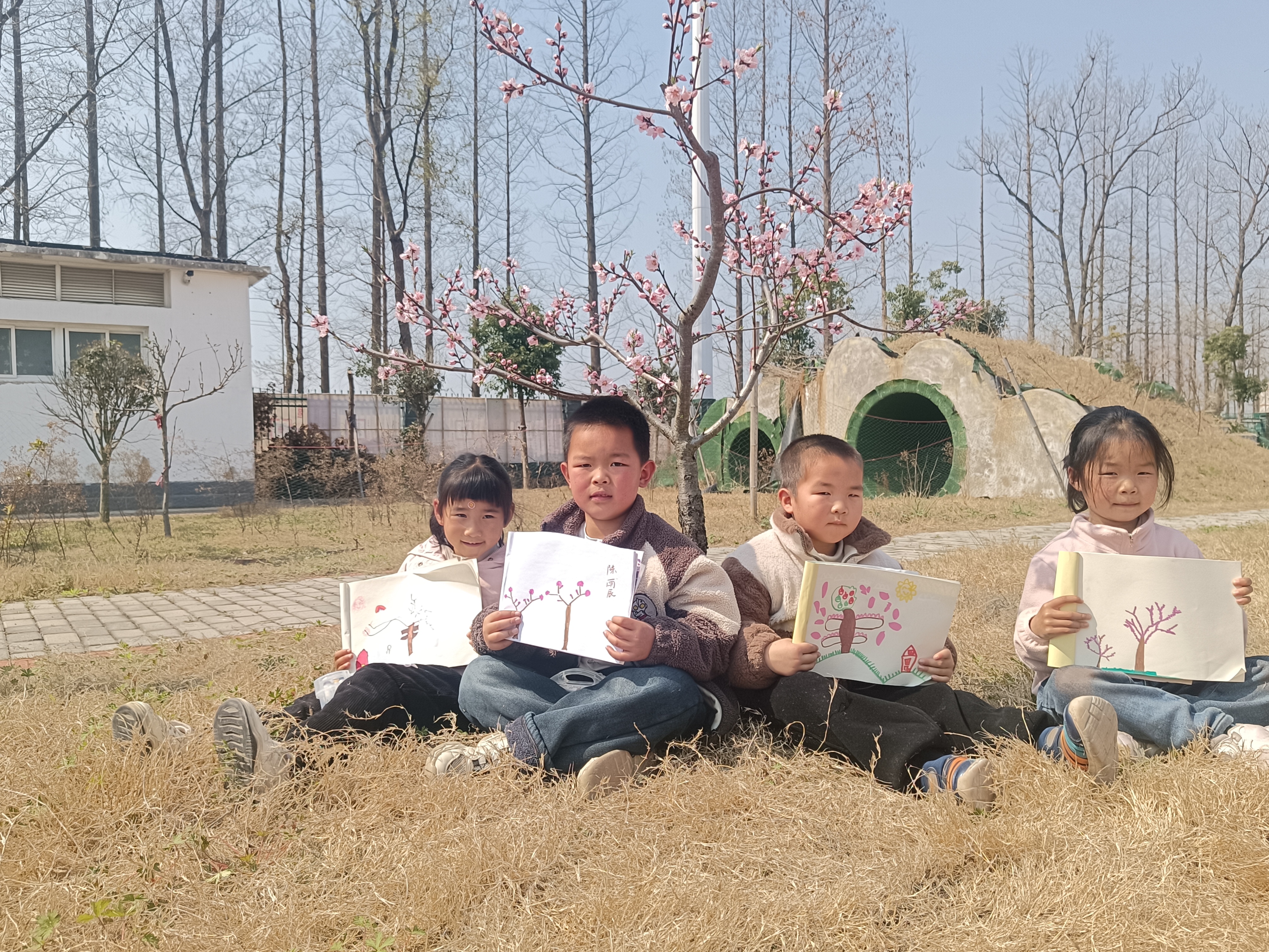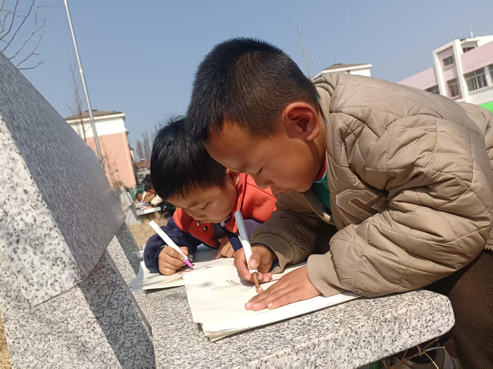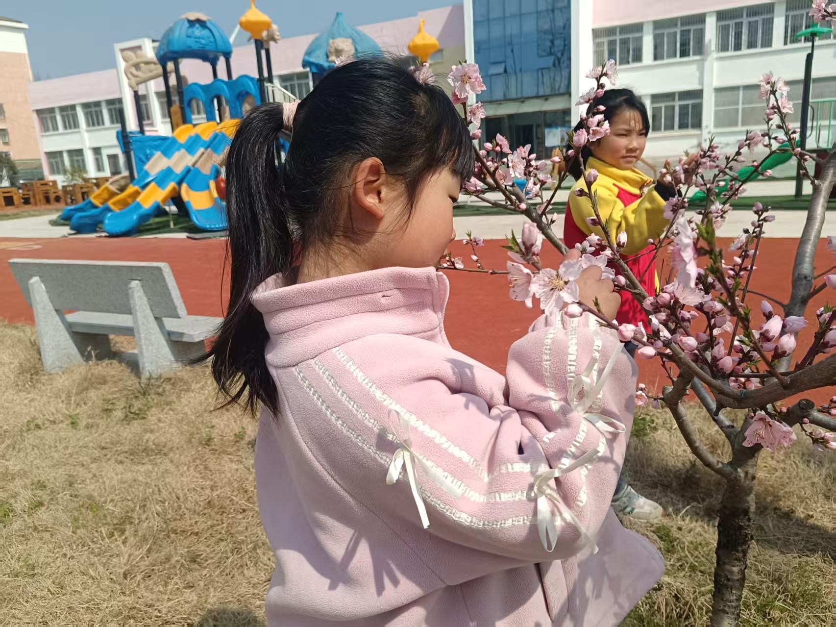 “我画的这朵最大!”“我的桃花会跳舞!”……童言稚语,响彻桃园。