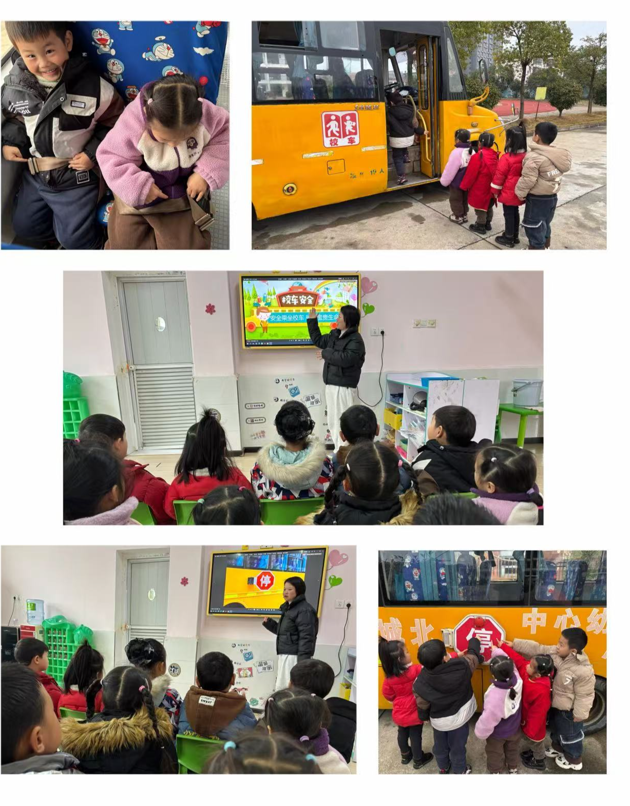 该园各班班主任结合幼儿年龄特点,通过案例剖析、知识问答、动画展示等多种形式,让学生直观认识校车安全的重要性。分别从候车、行车、下车等三个方面介绍乘坐校车安全知识,提醒学生按照约定时间到达指定位置等候上车,不要站在车道上等车;校车行驶中要坐稳扶好,不得随意站立、走动,更不得将头、手等身体部位伸出车外;校车到站时,要等车辆停稳后,仔细观察周围是否有车辆经过,再依次下车,下车后应走到红绿灯或者斑马线,确认安全后再通行。