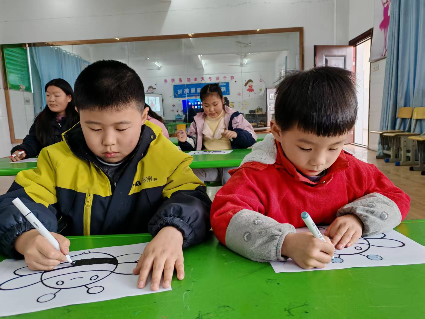 手工创作环节,志愿者示范风筝制作步骤,孩子们动手绘画、裁剪、粘贴,将童趣与春日意象融入作品,在互助协作中完成创作,收获满满。