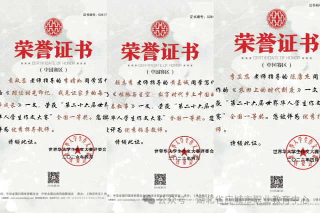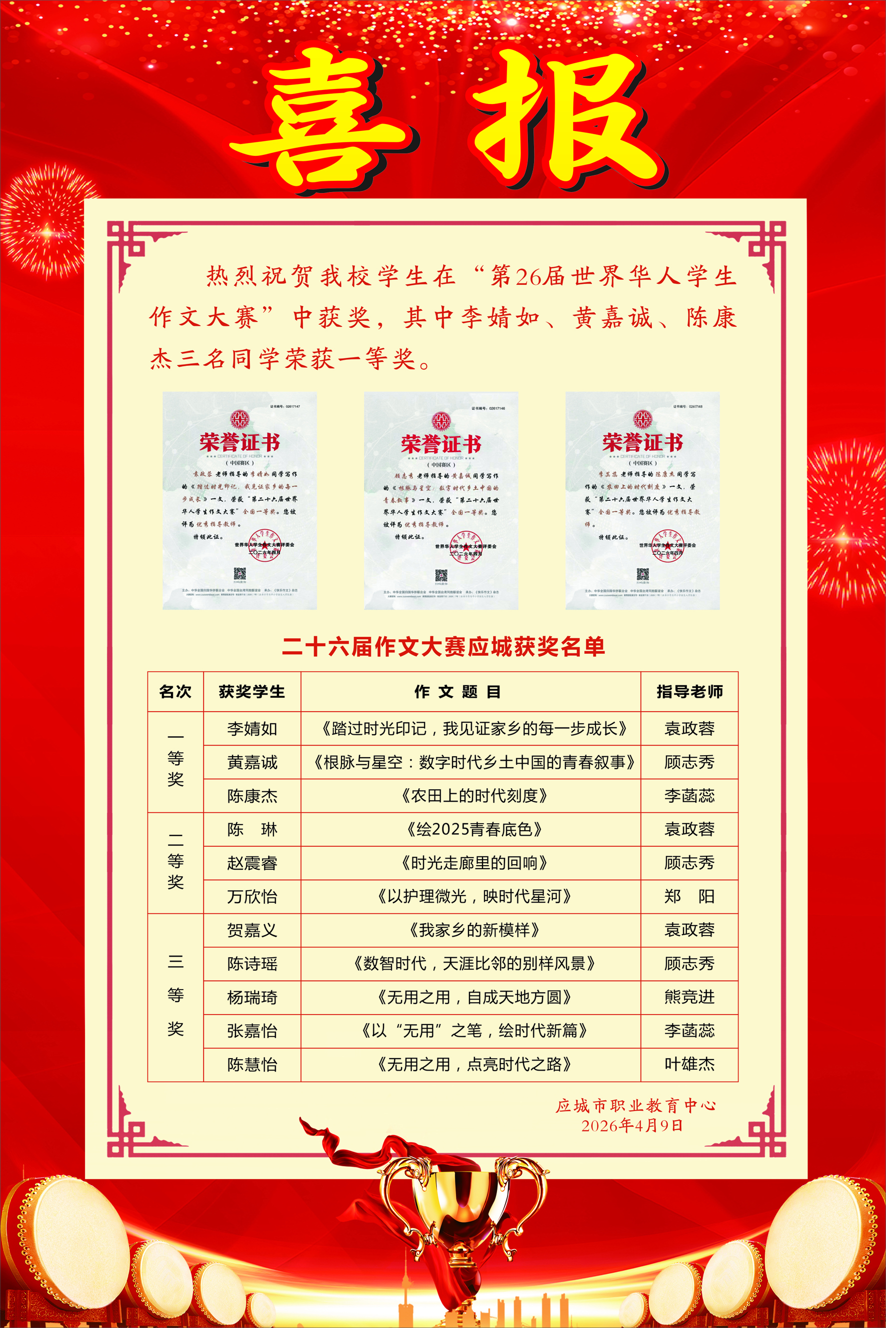 近日,在刚刚落幕的第26届世界华人学生作文大赛中,应城市职业教育中心学子凭借扎实文字功底、深刻思想见解与饱满创作热情,从众多参赛选手中脱颖而出,11名同学分获一、二、三等奖,用笔墨书写青春华章,一举拿下多个奖项,展现出该校学子卓越的语文素养与创作实力。