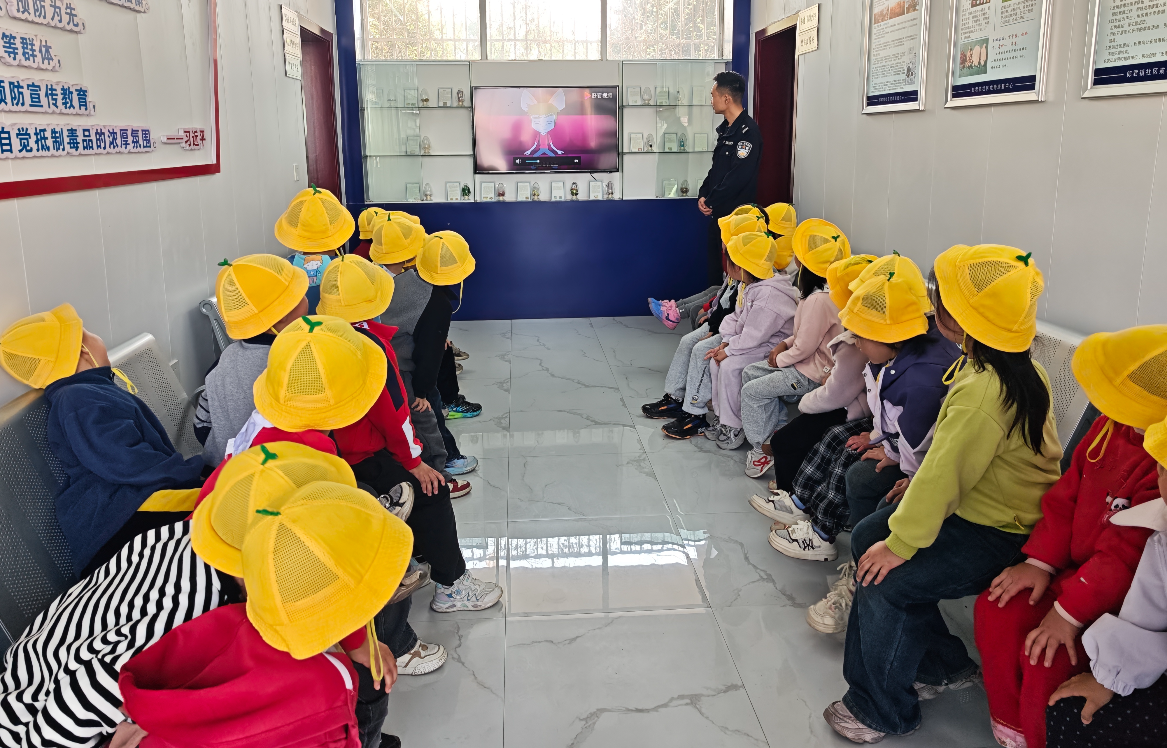 戒毒康复中心民警通过实物讲解、PPT宣传和视频案例,采用简单易懂的形式讲解毒品的种类及危害,教育小朋友不与陌生人接触,拒绝陌生人给的任何东西,保护好自己。