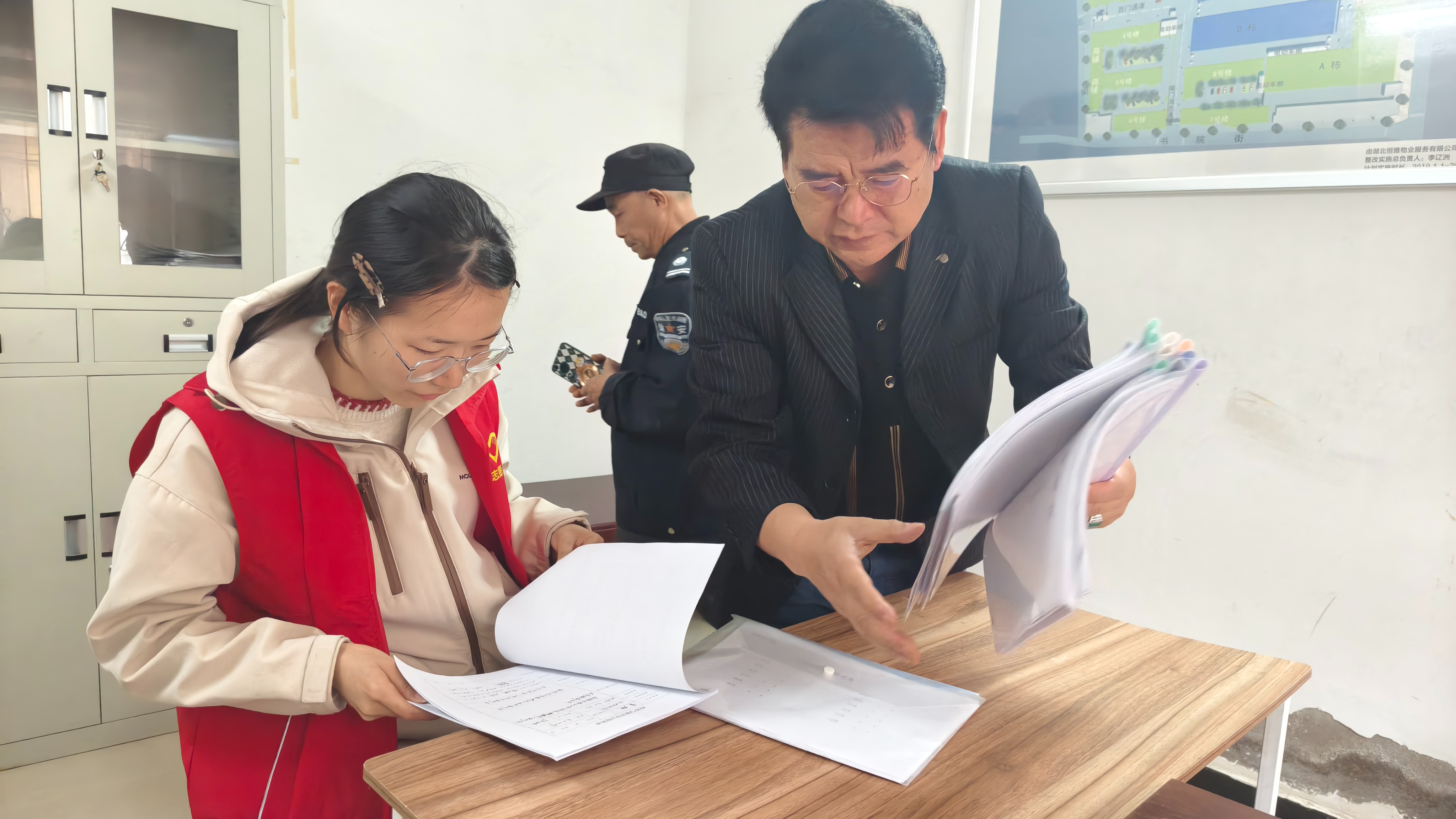 网格员与物业负责人面对面沟通,仔细查阅物业服务台账、安全巡查记录、业主诉求处理档案等资料,重点核查消防设施维护、环境卫生整治、应急值守落实等情况。