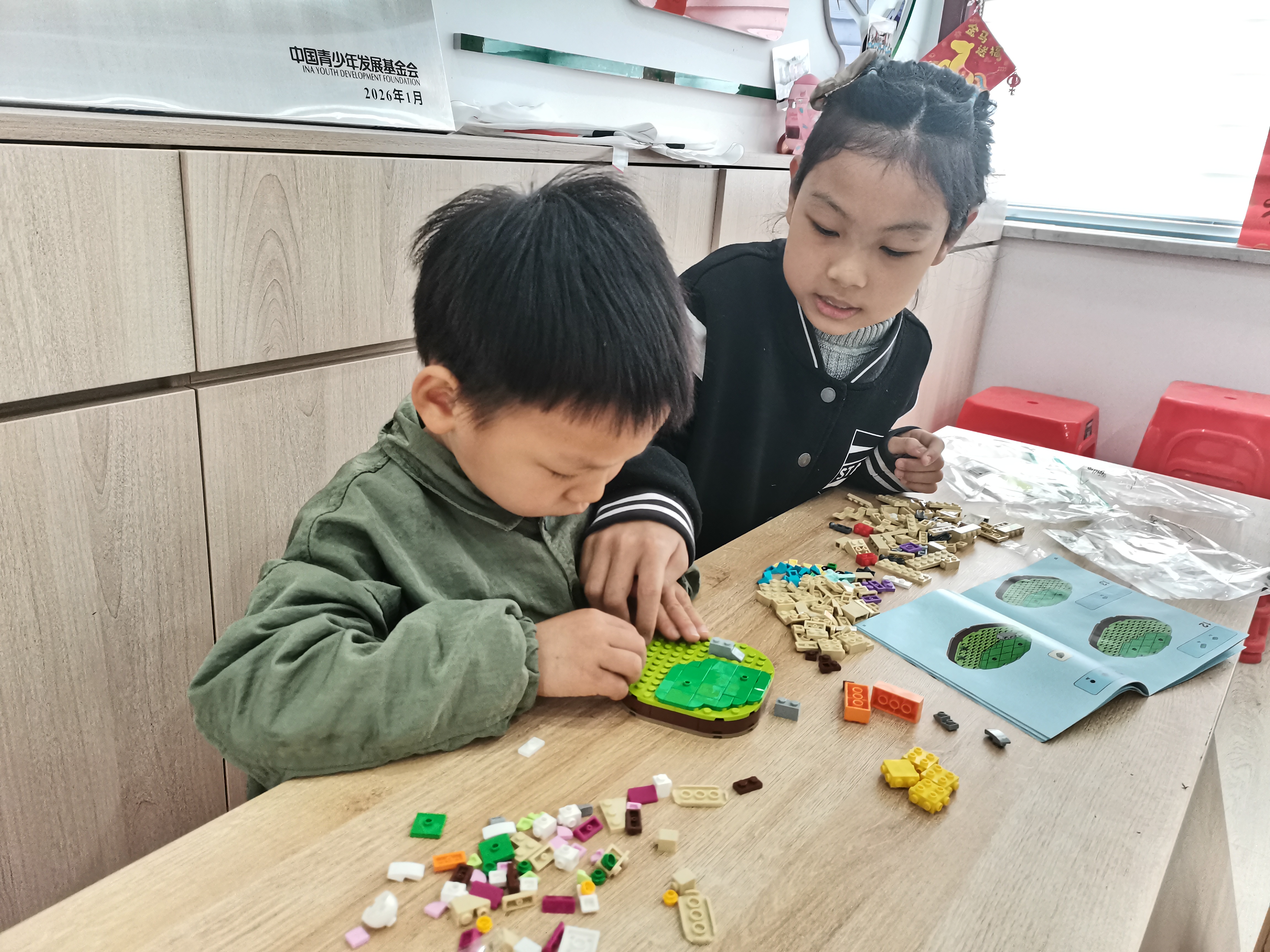 社工引导孩子们认真阅读乐高搭建说明书,讲解搭建要点与安全注意事项。