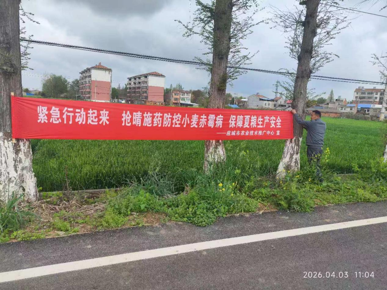 应城市农业技术推广中心强化宣传引导,在小麦主产乡镇悬挂宣传横幅,营造防控氛围,切实提升农户科学防控意识;组建技术指导专班,成立5个技术指导小组,实行分区分片责任制;组织农技人员深入田间地头,开展分类指导、精准施策,确保小麦赤霉病防控技术措施落实到田。