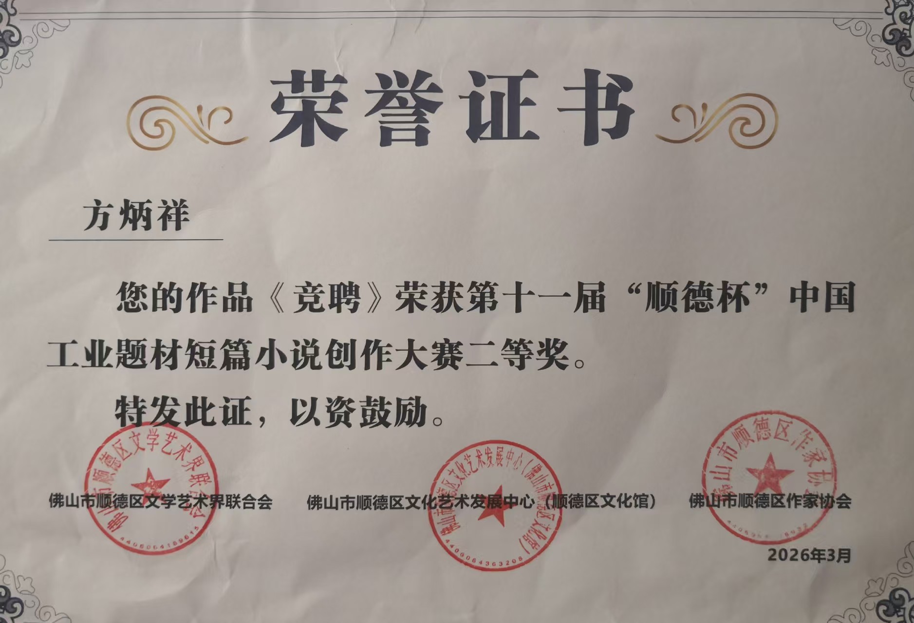 近日,记者从应城市作家协会获悉,湖北省作协会员、应城市黄滩镇方炳祥的作品《竞聘》荣获第十一届“顺德杯”中国工业题材短篇小说创作大赛二等奖。另外一名湖北参赛者获优秀奖。