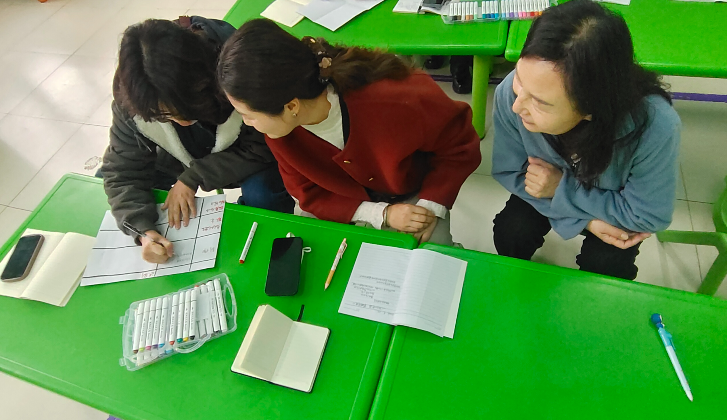 教师们分成两组,围绕案例展开“诊断式”讨论。你分析原因,我提出对策,她补充细节,白板上写满了关键词。小组代表分享时,观点碰撞出不少火花:“原来‘不打扰’也是一种互动”“等待比催促更有力量”。