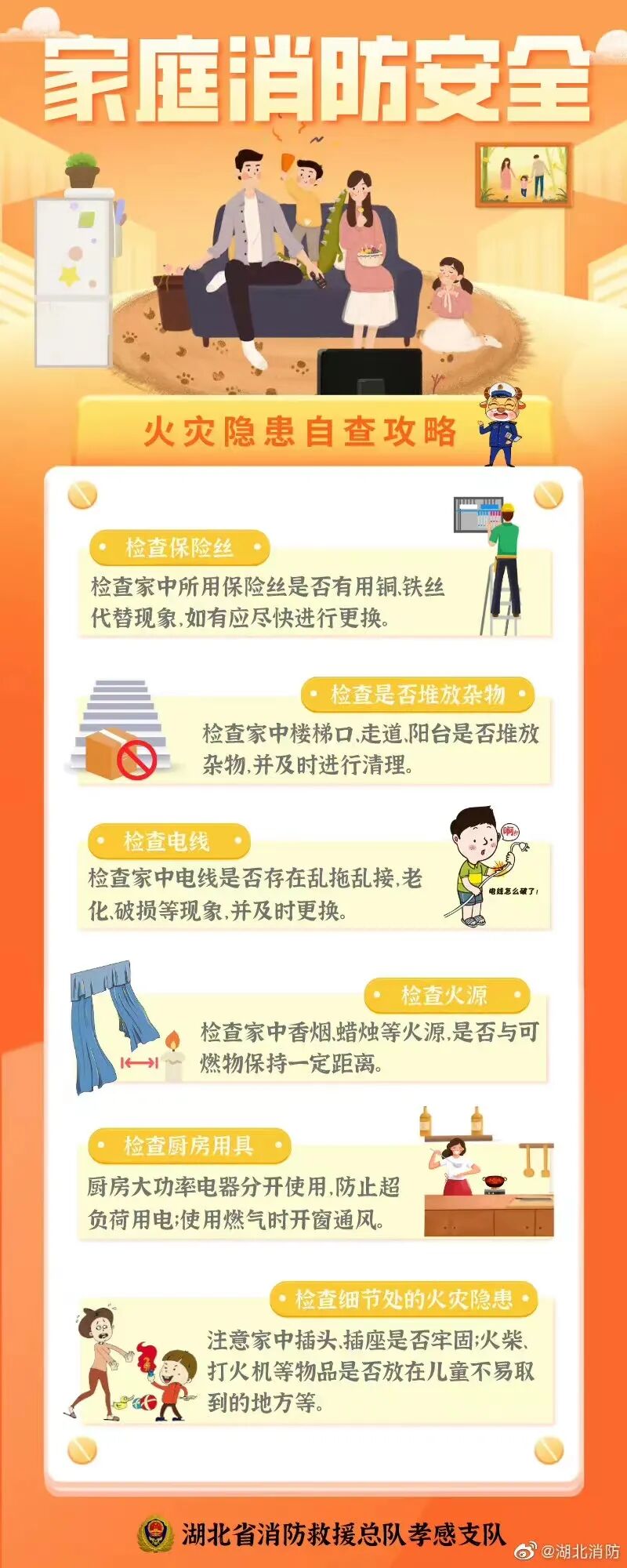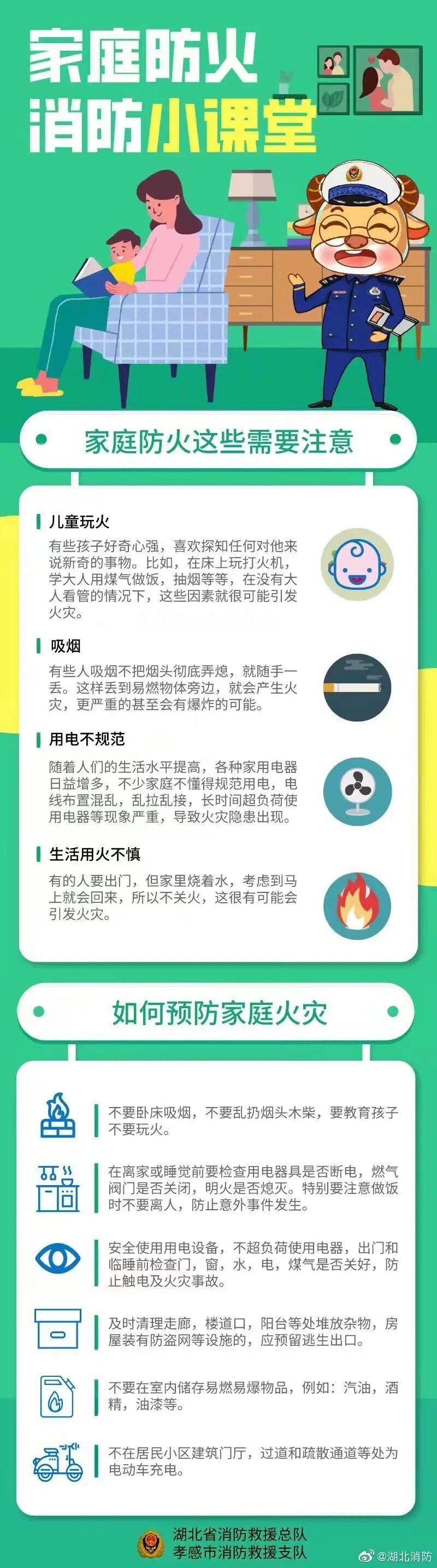 近期,学生们陆续放假或开始居家在线学习,恰逢过年用火、用电、用气量增大,火灾隐患增加,为做好这一特殊时期的消防安全宣传教育工作,切实增强家长和学生们的消防安全素质和自防自救能力,孝感市教育局联合孝感市消防救援支队提醒您,居家学习生活不能忽视家庭消防安全,要清除火灾隐患,远离火灾危害: